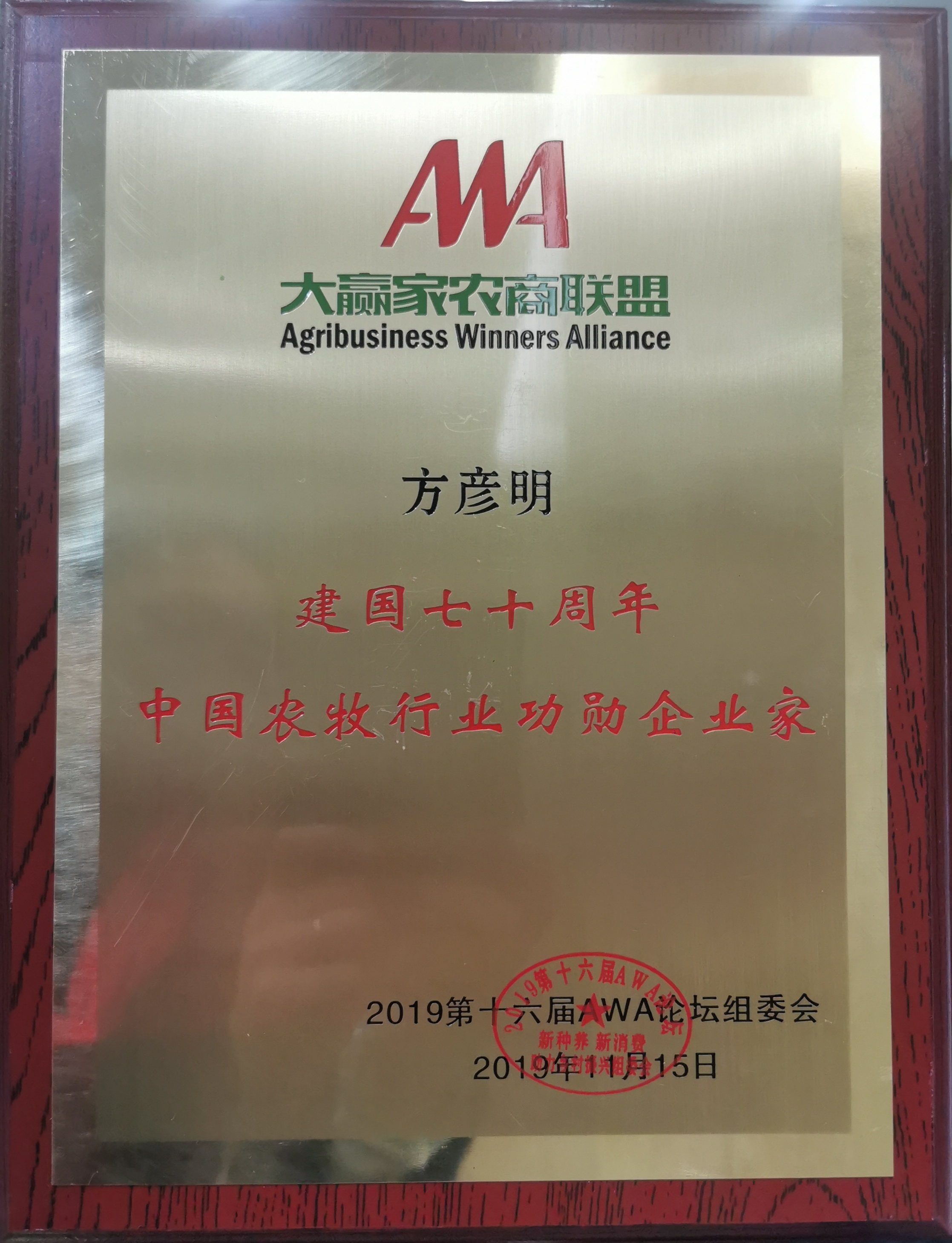 11月14-16日,由鄉(xiāng)村振興實(shí)施路徑研究國家重大課題組和AWA大贏家農(nóng)商聯(lián)盟主辦的2019第十六屆大贏家(AWA)論壇在北京市中國人民大學(xué)逸夫會議中心隆重召開,吉林和農(nóng)牧業(yè)集團(tuán)董事長方彥明先生榮獲建國70周年中國農(nóng)牧行業(yè)功勛企業(yè)家。